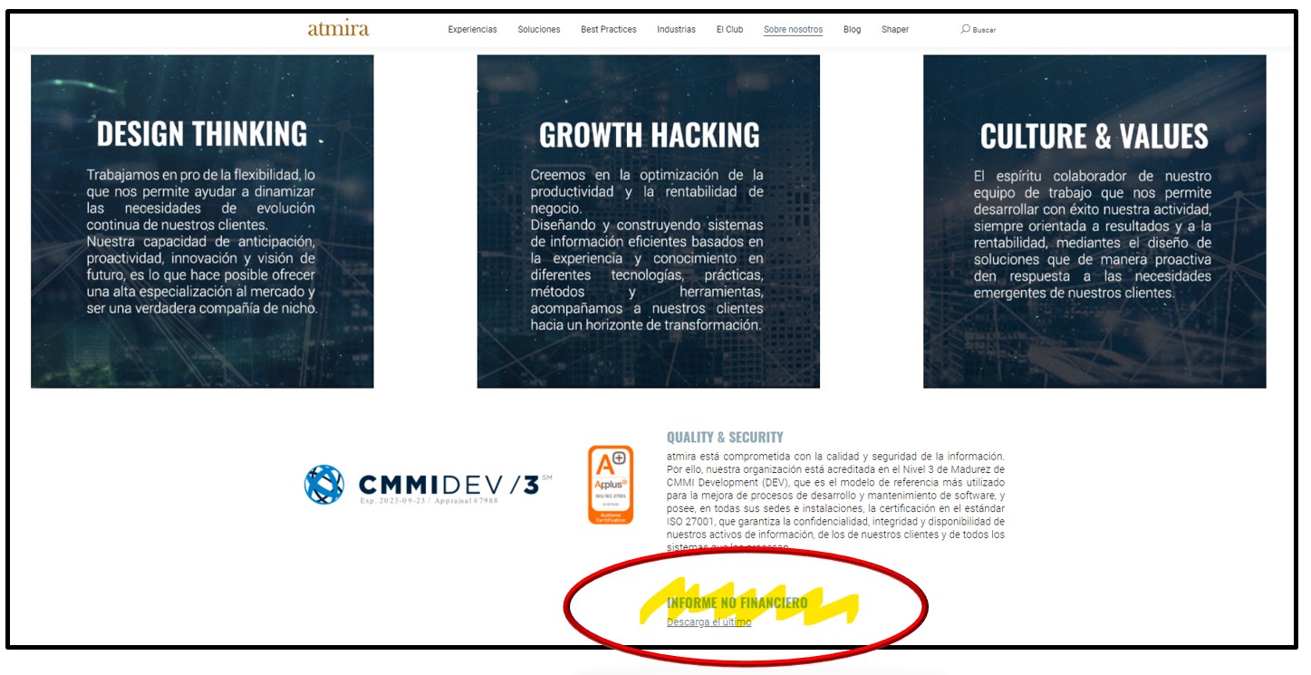 El documento se halla escondido en la web de Atmira https://atmira.com/sobre-nosotros/ , en su parte final bajo el texto INFORME NO FINANCIERO. Es un pdf en formato imagen, por lo que no podrás hacer búsquedas (de ahí que hayamos hecho un pequeño índice)… todo son facilidades para la transparencia en Atmira (ejem  ). En la parte de descargas os dejaremos el link completo para un acceso directo.
