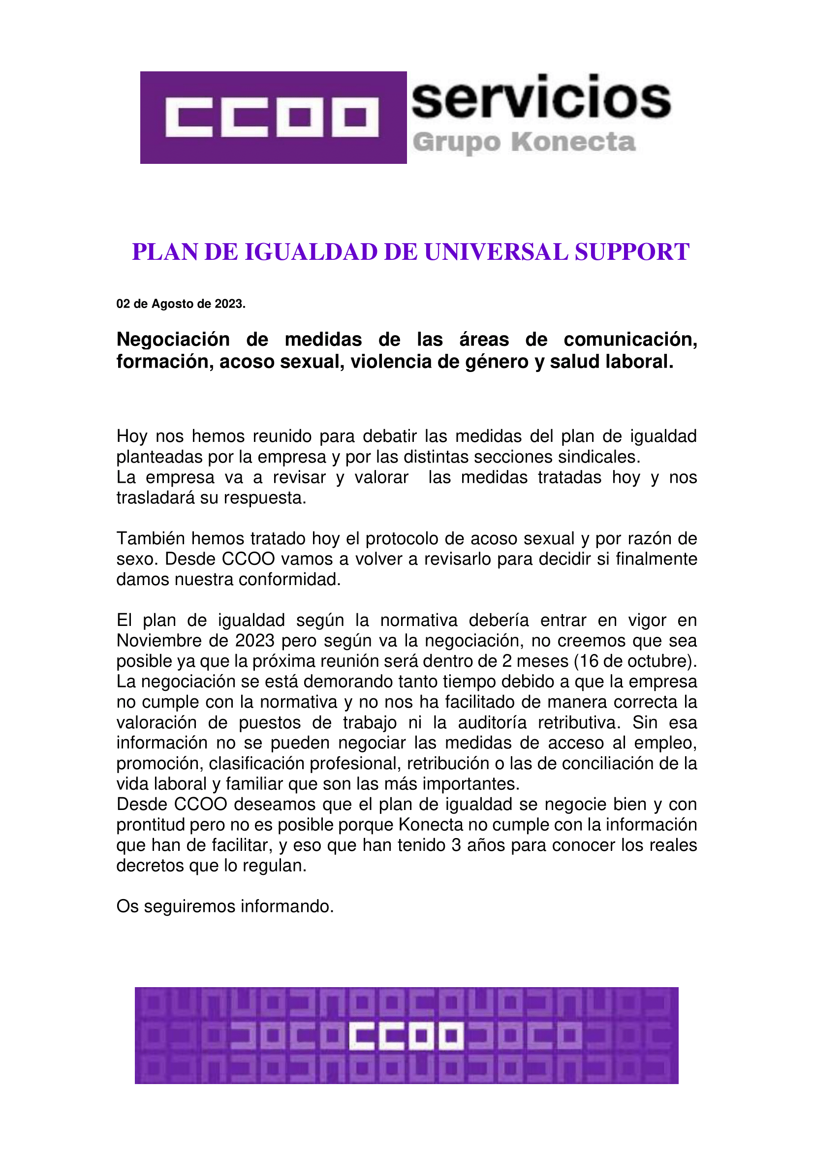 Desde CCOO deseamos que el plan de igualdad se negocie bien y con prontitud pero no es posible porque Konecta no cumple con la información que han de facilitar, y eso que han tenido 3 años para conocer los reales decretos que lo regulan.