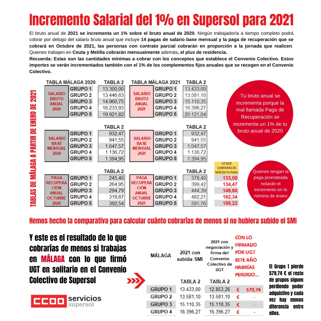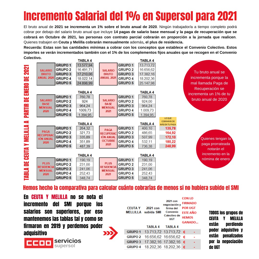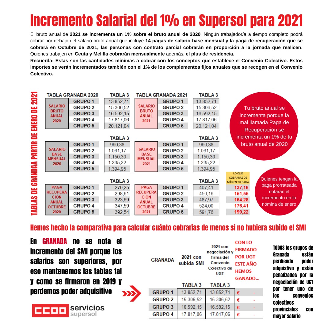 Las tablas salariales se actualizaron en 2020 con motivo del incremento del SMI (Salario Mínimo Interprofesional) para que los grupos profesionales que estaban por debajo del SMI se equiparasen. Si no se hubiese producido este incremento, la plantila de Supersol, en concreto los grupos y tablas que menos cobran, están condenados a recibir salarios muy bajos que rondan los 579 €/anuales.