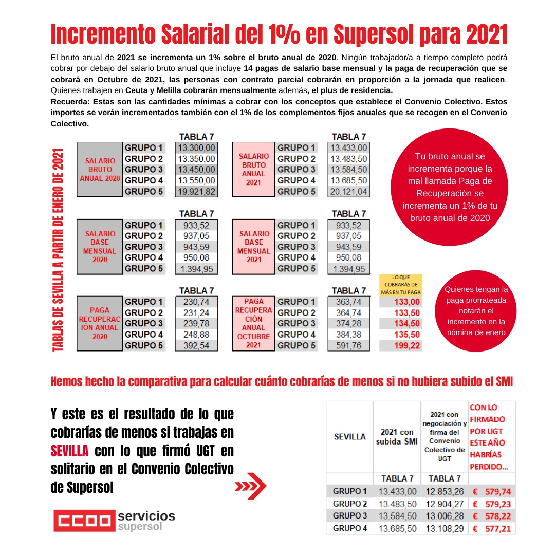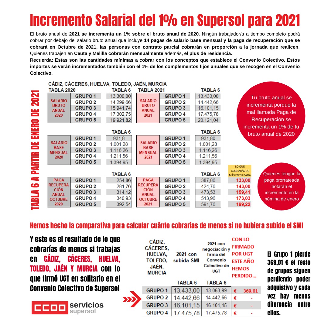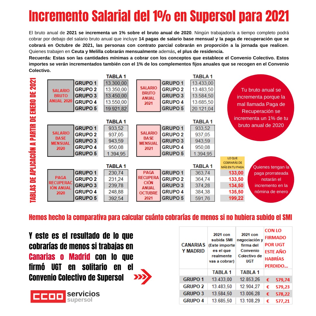 Las tablas salariales se actualizaron en 2020 con motivo del incremento del SMI (Salario Mínimo Interprofesional) para que los grupos profesionales que estaban por debajo del SMI se equiparasen. Si no se hubiese producido este incremento, la plantila de Supersol, en concreto los grupos y tablas que menos cobran, están condenados a recibir salarios muy bajos que rondan los 579 €/anuales.
