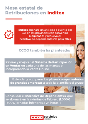 25/01/2022.- Como situamos de forma global en el reciente comunicado “Inditex: El momento de ir más allá” desde CCOO hemos conseguido impulsar en Inditex un proceso de negociación global de aplicación a todas las marcas y territorios, a través de la Mesa estatal de Retribuciones comprometida en el Acuerdo del 18/11 y el Plan de Igualdad. En esos espacios, y como detallábamos en dicho comunicado, desde CCOO reivindicamos avances de calado en las condiciones laborales del conjunto del Grupo: Salarios, condiciones sociales, promoción, organización del tiempo e igualdad de oportunidades. Porque todas somos Inditex.