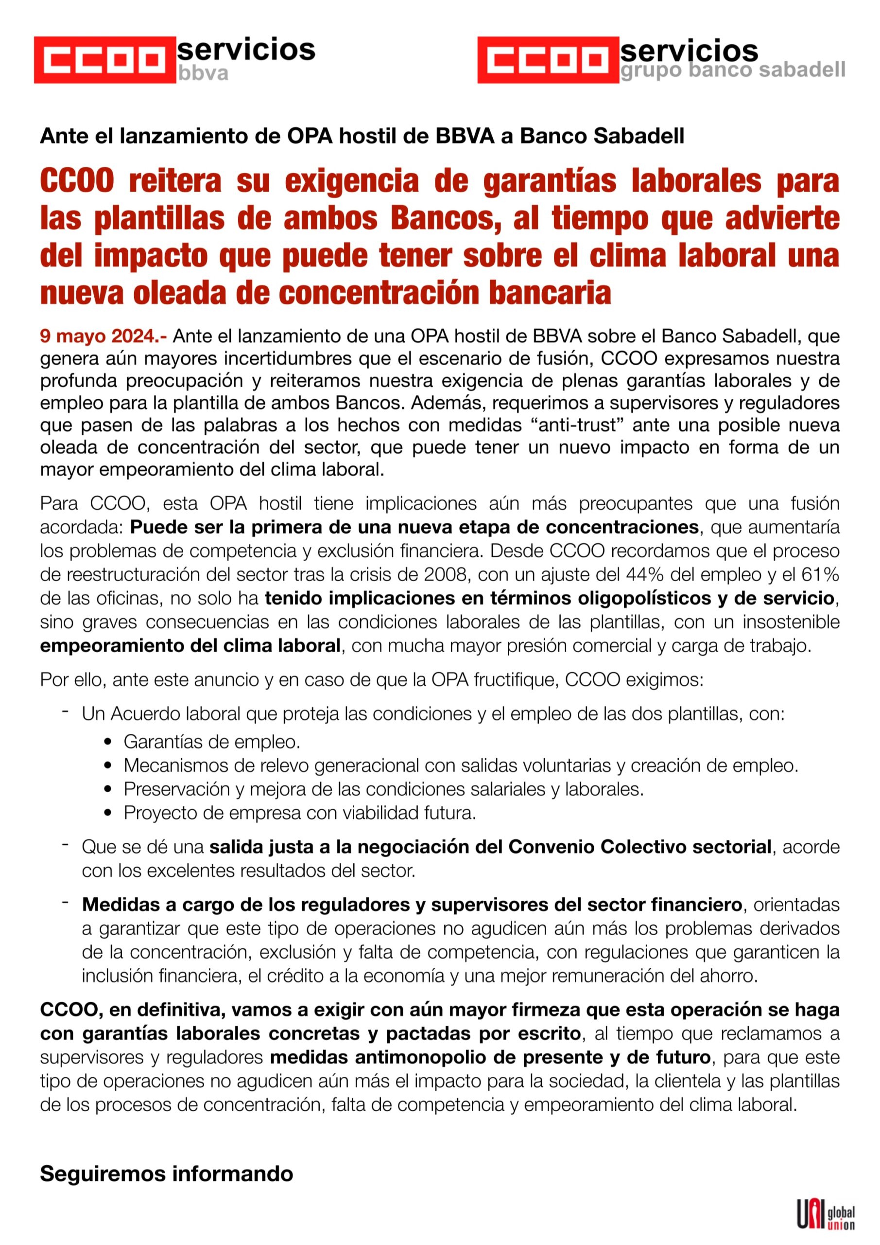 INFO CCOO sobre la OPA de BBVA a Banco Sabadell
