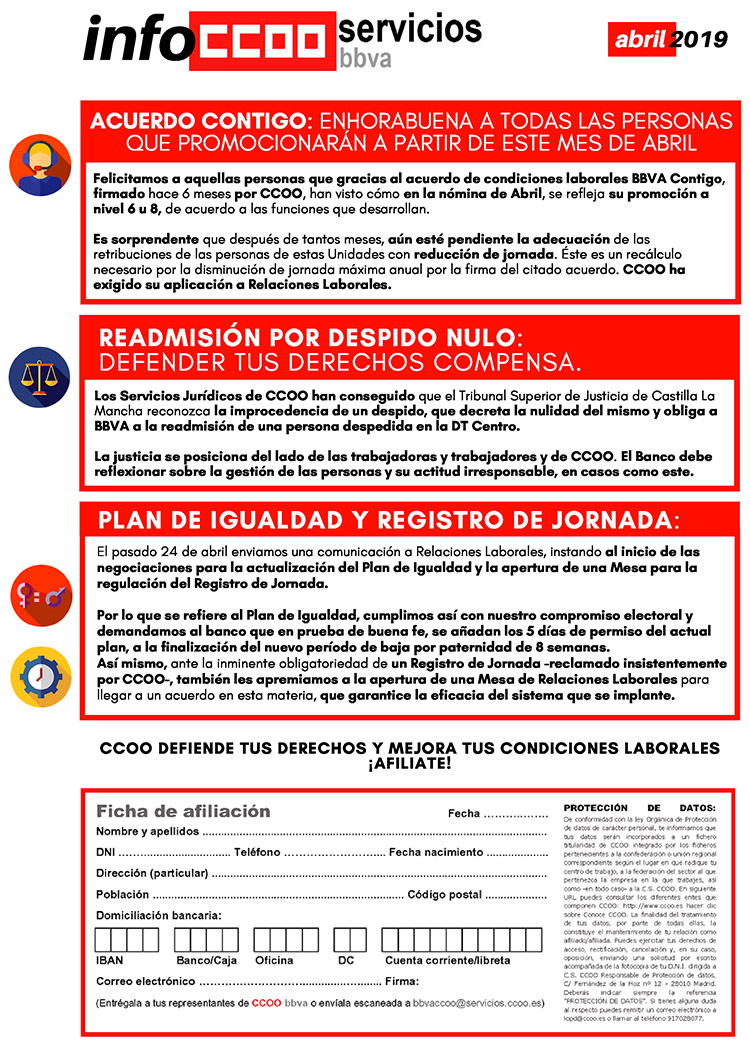 Información sobre Acuerdo Contigo, Readmisión por despido nulo, Plan de Igualdad y Registro de Jornada.