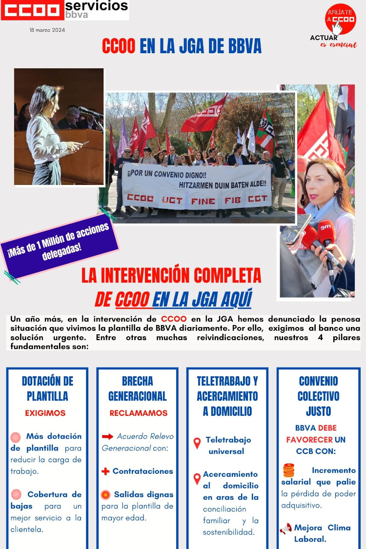 Un año más, en la intervención de CCOO en la JGA hemos denunciado la penosa situación que vivimos la plantilla de BBVA diariamente. Por ello, exigimos al banco una solución urgente. Entre otras muchas reivindicaciones, nuestros 4 pilares fundamentales.
