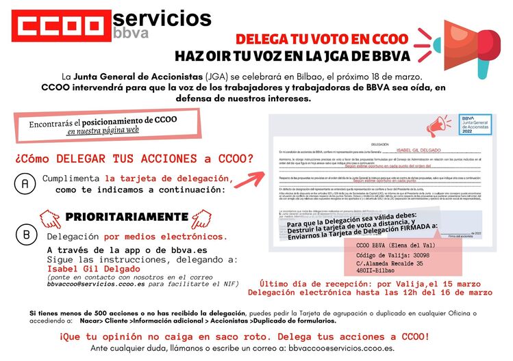 La Junta General de Accionistas (JGA) se celebrará en Bilbao, el próximo 18 de marzo. CCOO intervendrá para que la voz de los trabajadores y trabajadoras de BBVA sea oída, en defensa de nuestros intereses.