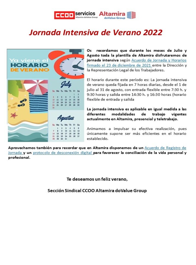 Os recordamos que durante los meses de Julio y Agosto toda la plantilla de Altamira y Adsolum disfrutaremos de jornada intensiva según Acuerdo de Jornada y Horarios firmado el 23 de diciembre de 2021 .