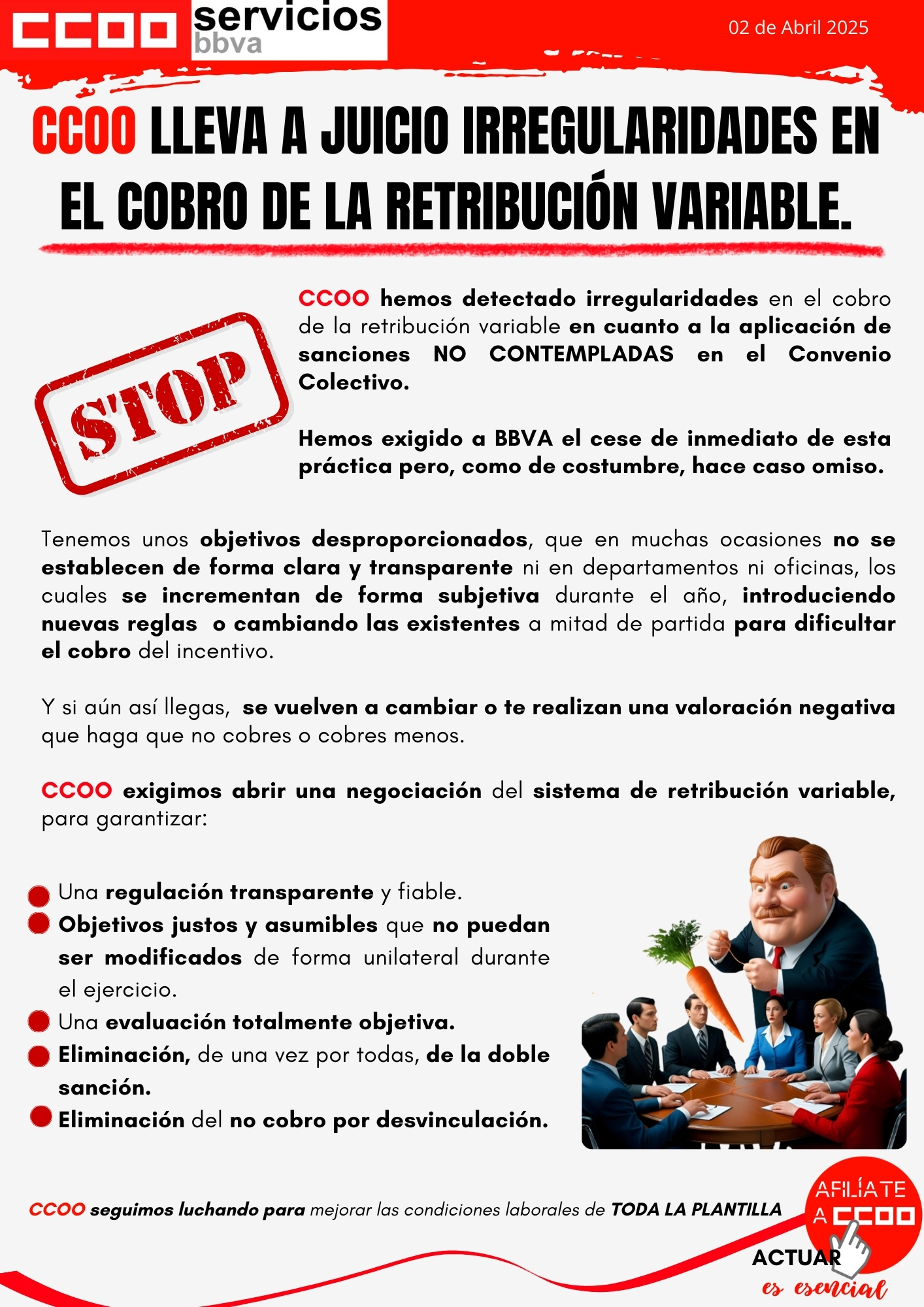 TRAS DETECTAR CCOO IRREGULARIDADES EN LA RETRIBUCIÓN VARIABLE Y TRAS EL CASO OMISO POR PARTE DE BBVA A RECTIFICAR.