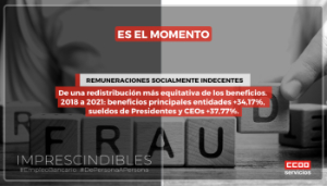 Que, mientras las cúpulas del sector descuidan e ignoran a las plantillas, además de negarse a compensar su pérdida de poder adquisitivo por una inflación imprevista, se cuidan a sí mismos: Entre 2018 y 2021 los beneficios de las principales entidades han subido un 34,17% y los sueldos de Presidentes y CEOs un 37,77%.