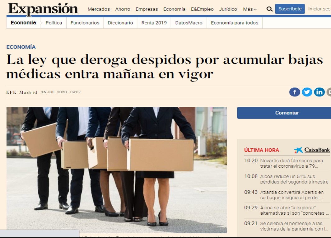 Expansión – La ley que deroga despidos por acumular bajas médicas entra en vigor