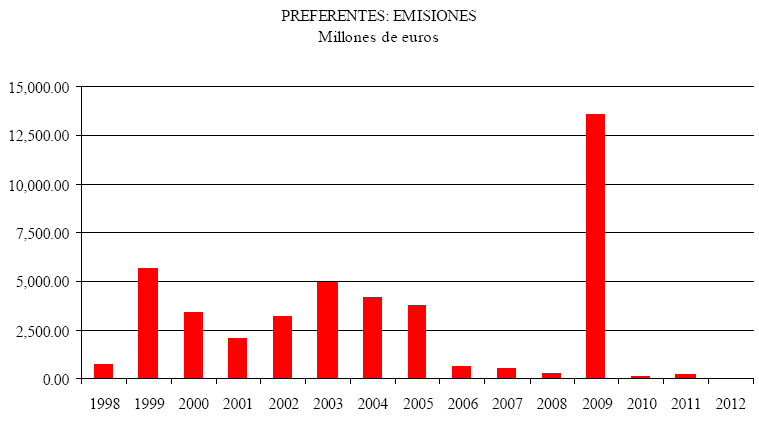 En el cuadro siguiente, obtenido con Estadísticas AIAF (Mercado de Renta Fija) puede verse que en 1998-1999 comienzan a emitirse las preferentes y en 2009 hay ya más de 13.500 millones de euros, cuando tras el boom inmobiliario, las entidades de crédito quedaron agotadas y precisaban una financiación que permaneciera estable.