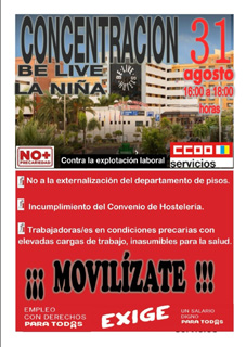 Desde CCOO SERVICIOS CANARIAS se ha organizado una movilización el día 31 de Agosto a partir de las 16 a hasta las 18 horas ante el Hotel Be Live Experience La Niña en Costa Adeje, nuevamente hacia la empresa BE LIVE (GLOBALIA) y la multiservicios GENSER.