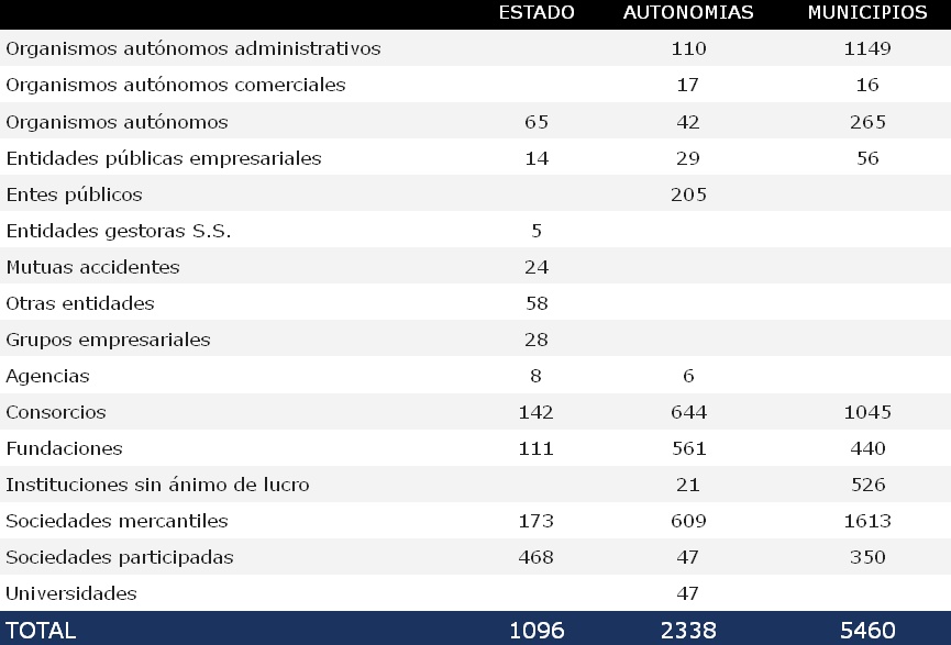 En lo que respecta a empresas, el cuadro muestra como «Sociedades mercantiles» a aquellas en las que las administraciones cuentan con mayoría de capital o con mayoría del consejo, mientras que «Sociedades participadas» son aquellas en que las administraciones tienen una participación minoritaria.
