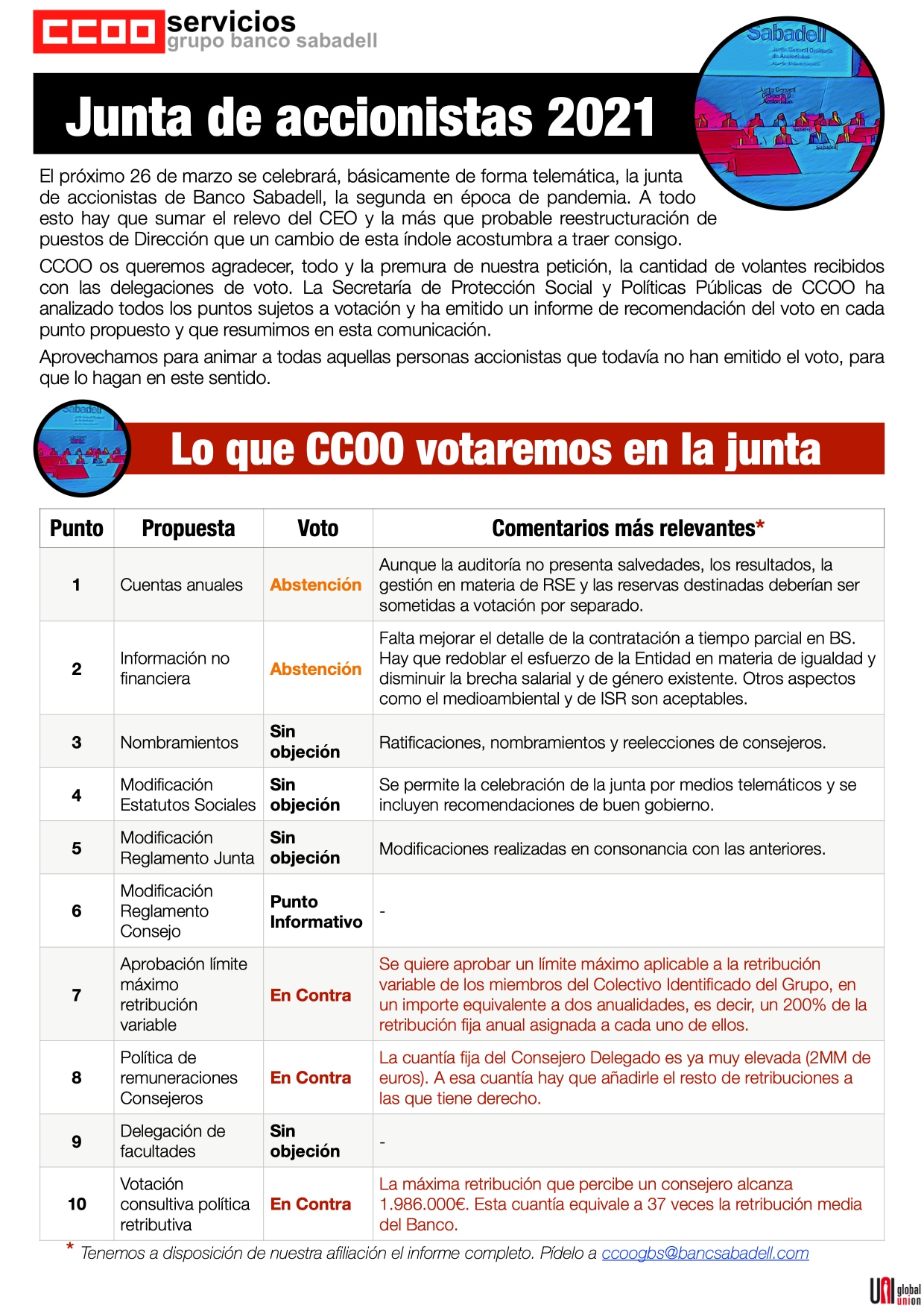 Lo que CCOO votaremos en la Junta de Accionistas de Banco Sabadell