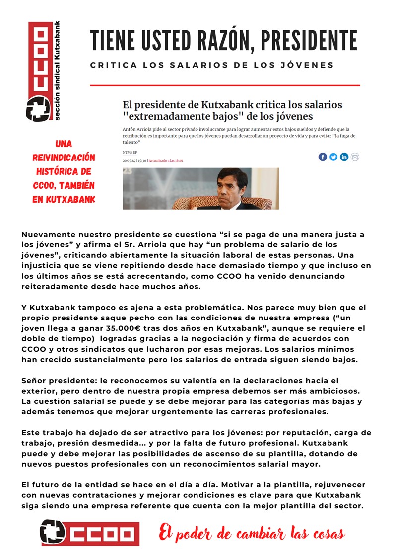 El presidente de Kutxabank vuelve a reiterar que los salarios de los jóvenes deben incrementarse. Desde CCOO lo apoyamos pero vamos un poco más allá.