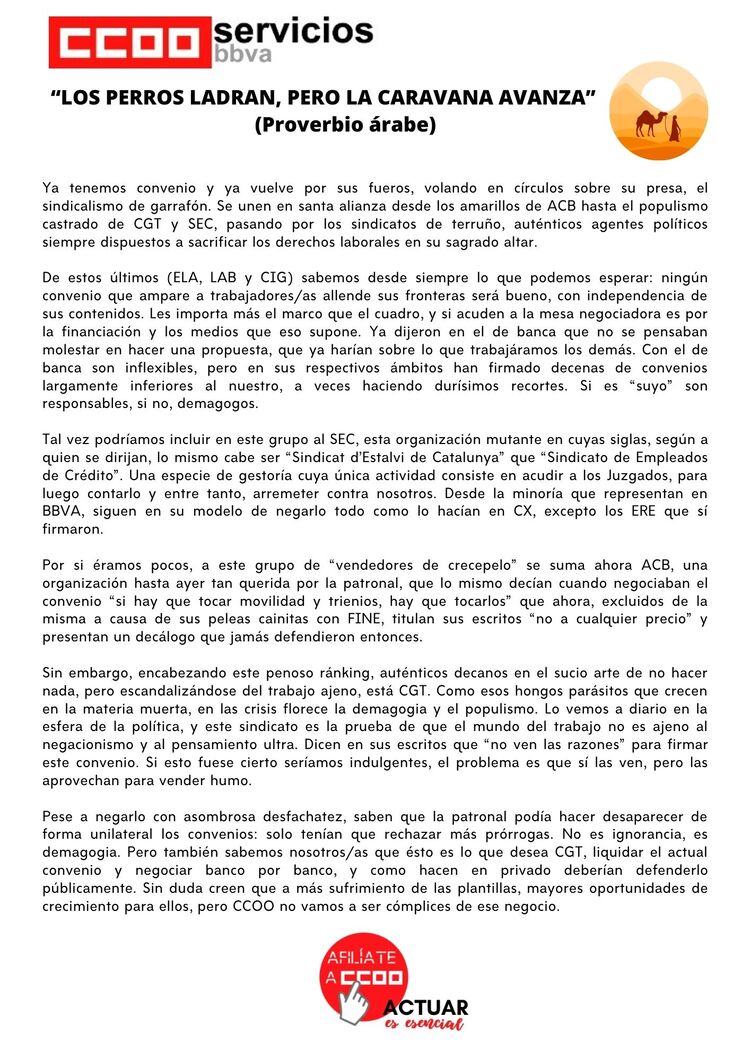 Ya tenemos convenio y ya vuelve por sus fueros, volando en círculos sobre su presa, el sindicalismo de garrafón. Se unen en santa alianza desde los amarillos de ACB hasta el populismo castrado de CGT y SEC, pasando por los sindicatos de terruño, auténticos agentes políticos siempre dispuestos a sacrificar los derechos laborales en su sagrado altar.