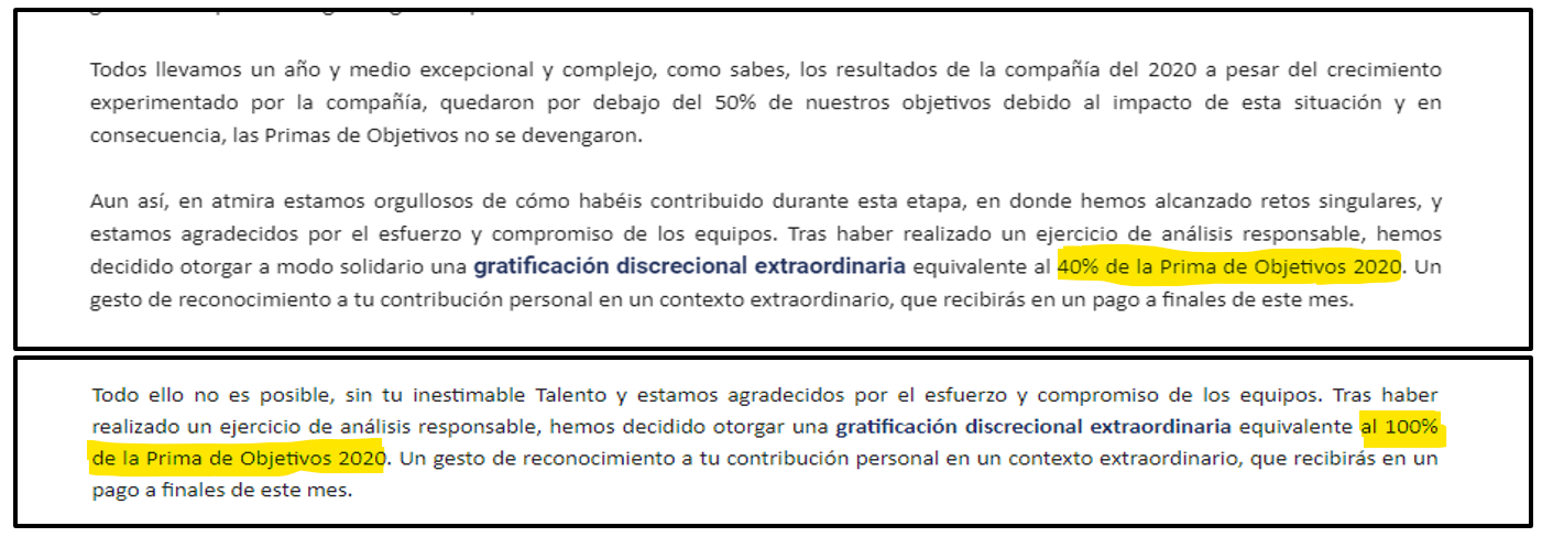 Días atrás el CEO de Atmira envió unos correos con el asunto “ATMIRA NEWS I Reconocimiento al compromiso” (recalcamos “al compromiso”) a determinados equipos indicando que van a gratificarles, a los receptores del mismo, con un porcentaje de su prima de objetivo como reconocimiento a su trabajo y esfuerzo. Y seguramente muchos lo habréis cobrado en estos días.