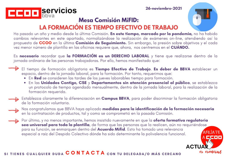 – El tiempo de formación obligatoria es Tiempo Efectivo de Trabajo. Es deber de BBVA establecer un espacio, dentro de la jornada laboral, para la formación. Por tanto, requerimos que: