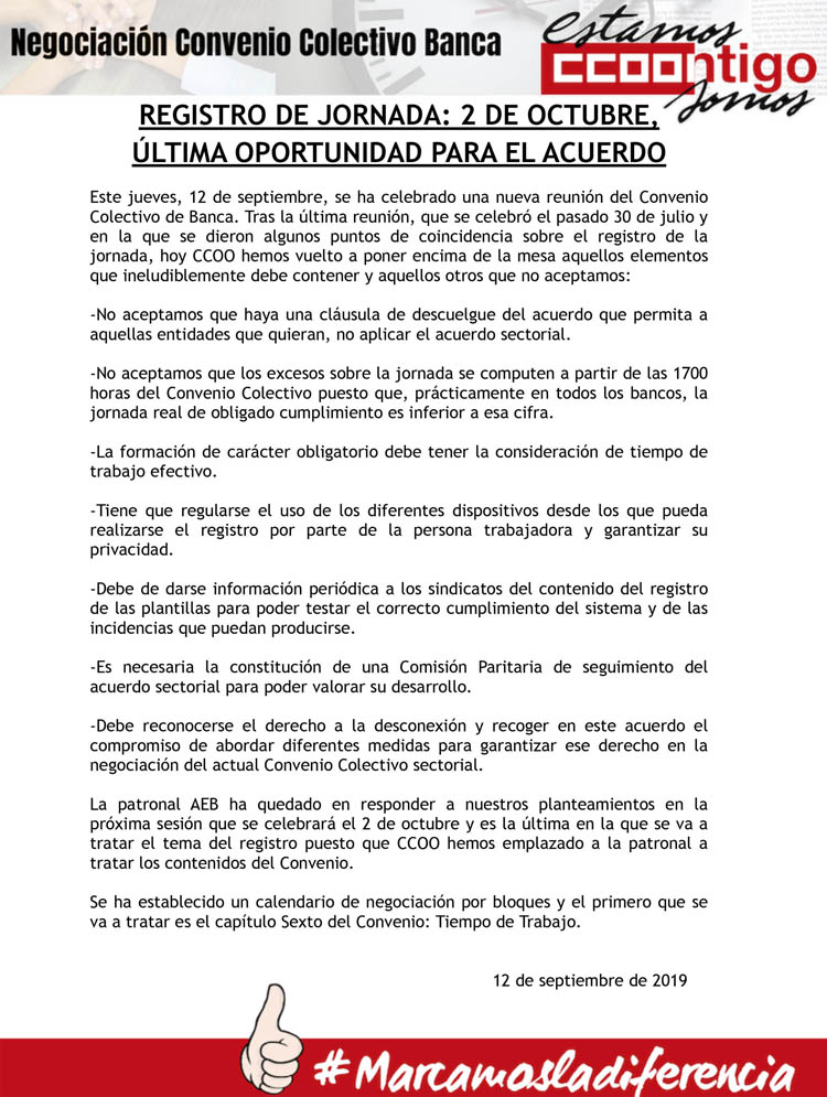El pasado jueves, 12 de septiembre, se ha celebrado una nueva reunión del Convenio Colectivo de Banca. Tras la última reunión, que se celebró el pasado 30 de julio y en la que se dieron algunos puntos de coincidencia sobre el registro de la jornada, hoy CCOO hemos vuelto a poner encima de la mesa aquellos elementos que ineludiblemente debe contener y aquellos otros que no aceptamos.