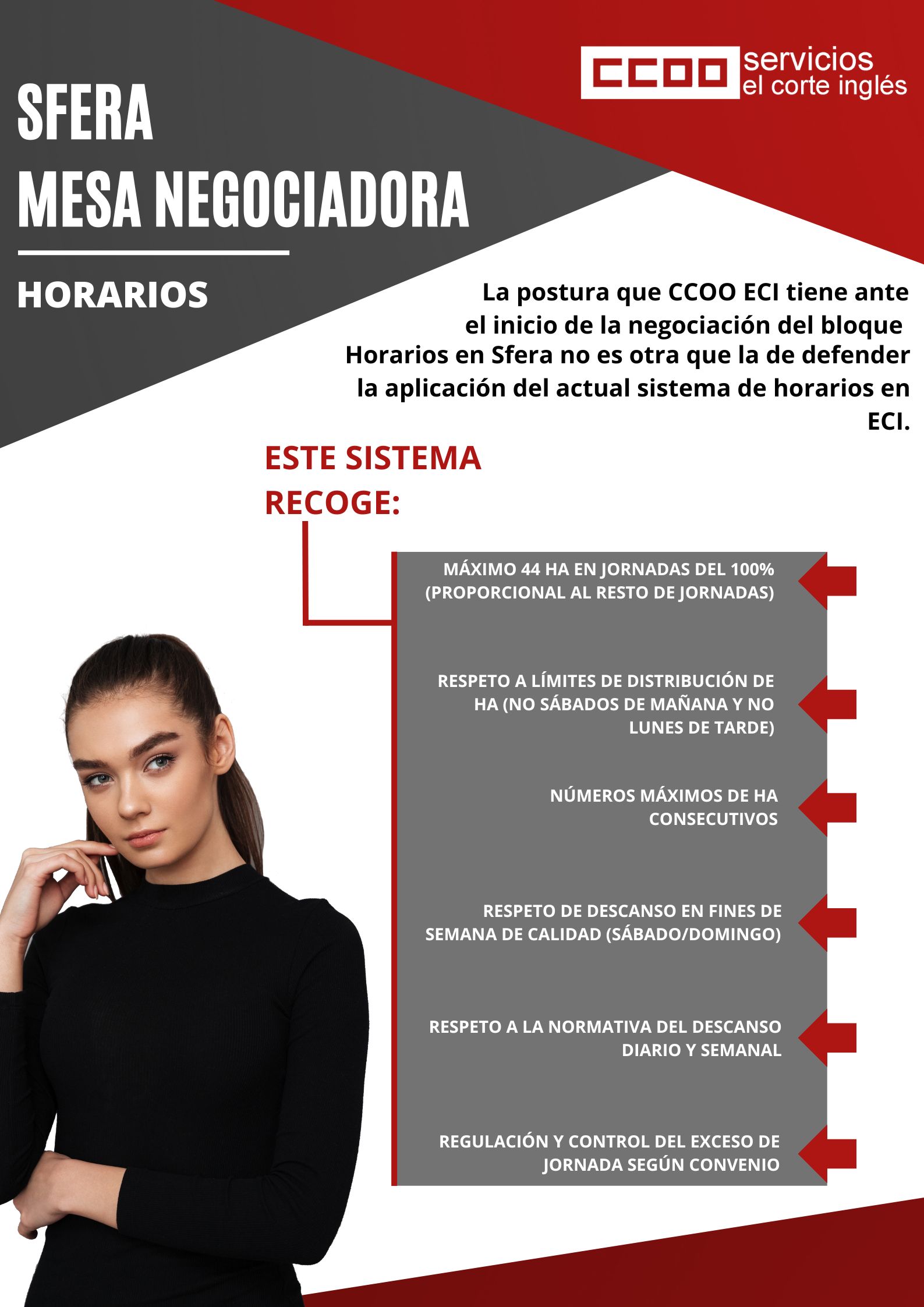 Hoy, 22 de noviembre, se mantendrá la segunda reunión de la mesa negociadora de las condiciones laborales de Sfera. Hoy toca hablar sobre el bloque de HORARIOS , a continuación os mostramos la postura de CCOO ECI al respecto