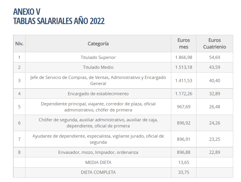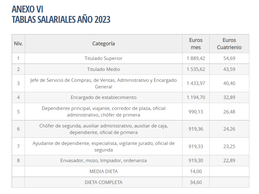 - Modificación de las tablas salariales anexas incluyendo el importe de las dietas. Pese a que el artículo 15 del Convenio Colectivo dispone que «se fijan las dietas en la cantidad que figura en los correspondientes anexos», las cantidades a abonar por el concepto de dieta (dieta completa y media dieta) no están reflejados en las tablas salariales anexas correspondientes a los años 2018 a 2023. Por ello procede su modificación e inserción en cada uno de los anexos (I a VI) del importe correspondiente a los conceptos de dieta completa y media dieta para cada año, en las cuantías que se detallan a continuación, quedando dichos anexos como sigue:
