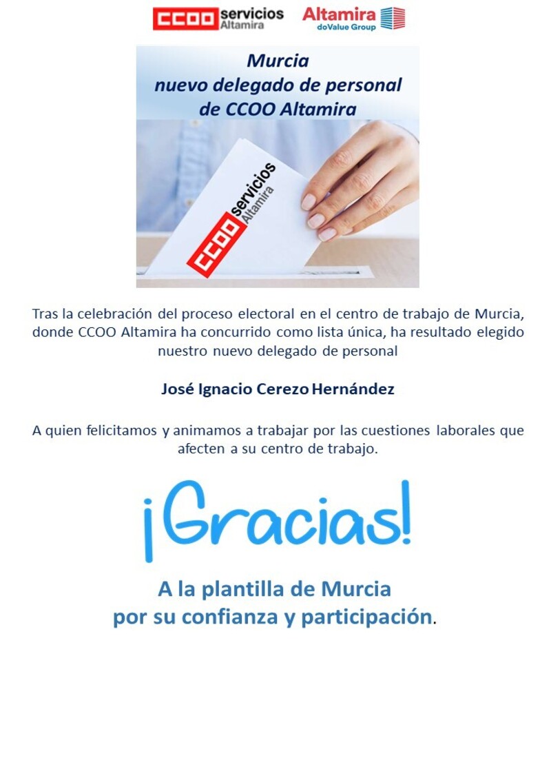 Tras la celebración del proceso electoral en el centro de trabajo de Murcia, donde CCOO Altamira ha concurrido como lista única, ha resultado elegido un nuevo delegado de personal.