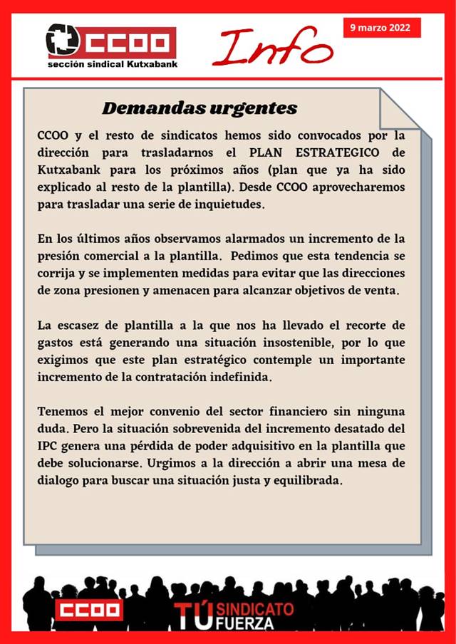 Convocados por la dirección de Kutxabank planteamos las que consideramos para CCOO como cuestiones urgentes a abordar lo antes posible.