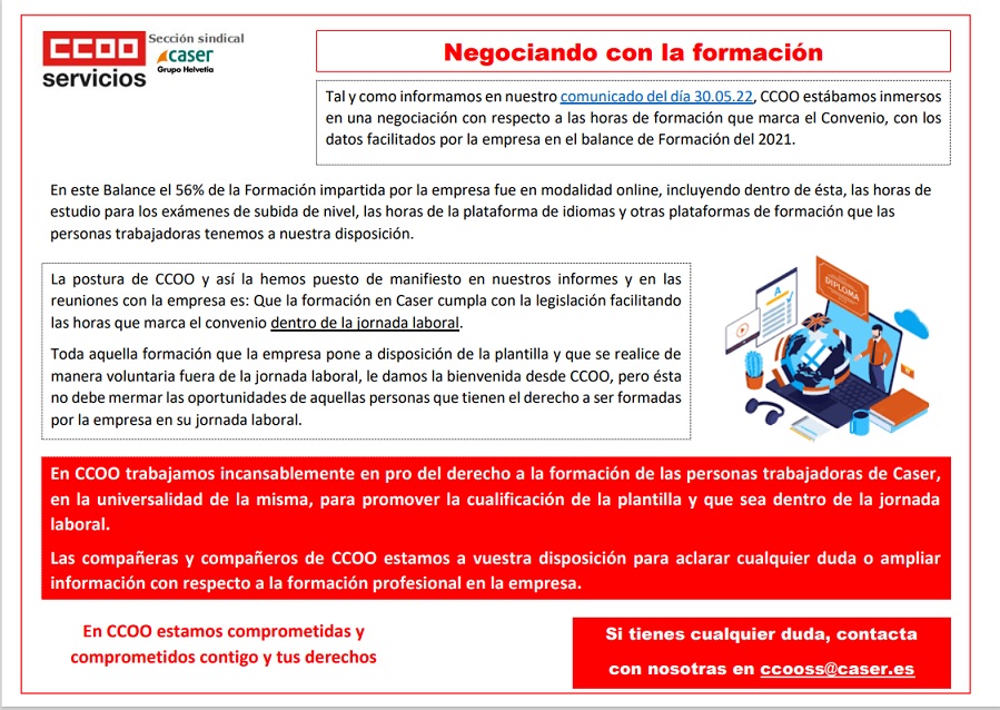 Tal y como informamos en nuestro comunicado del día 30.05.22, CCOO estábamos inmersos en una negociación con respecto a las horas de formación que marca el Convenio, con los datos facilitados por la empresa en el balance de Formación del 2021.