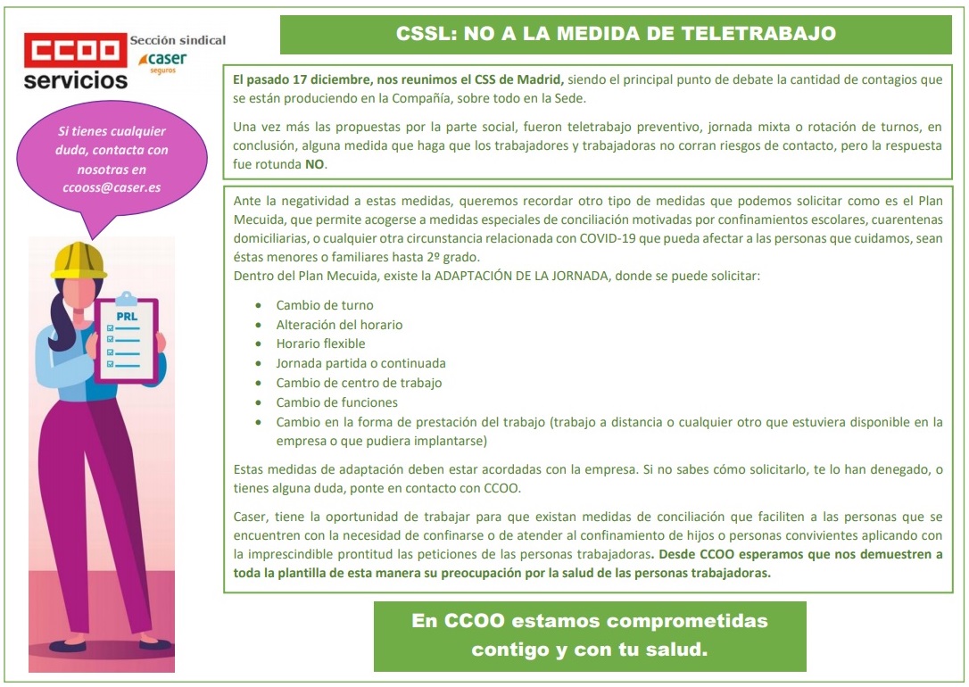El pasado 17 diciembre, nos reunimos el CSS de Madrid, siendo el principal punto de debate la cantidad de contagios que se están produciendo en la Compañía, sobre todo en la Sede.