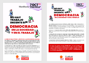 En este 7 de octubre, Jornada Mundial por el Trabajo Decente, desde CCOO reivindicamos la democracia en la sociedad y en el trabajo, como un valor fundamental para lograr el trabajo decente, humanizar las relaciones de trabajo y garantizar los derechos fundamentales de las personas trabajadoras.