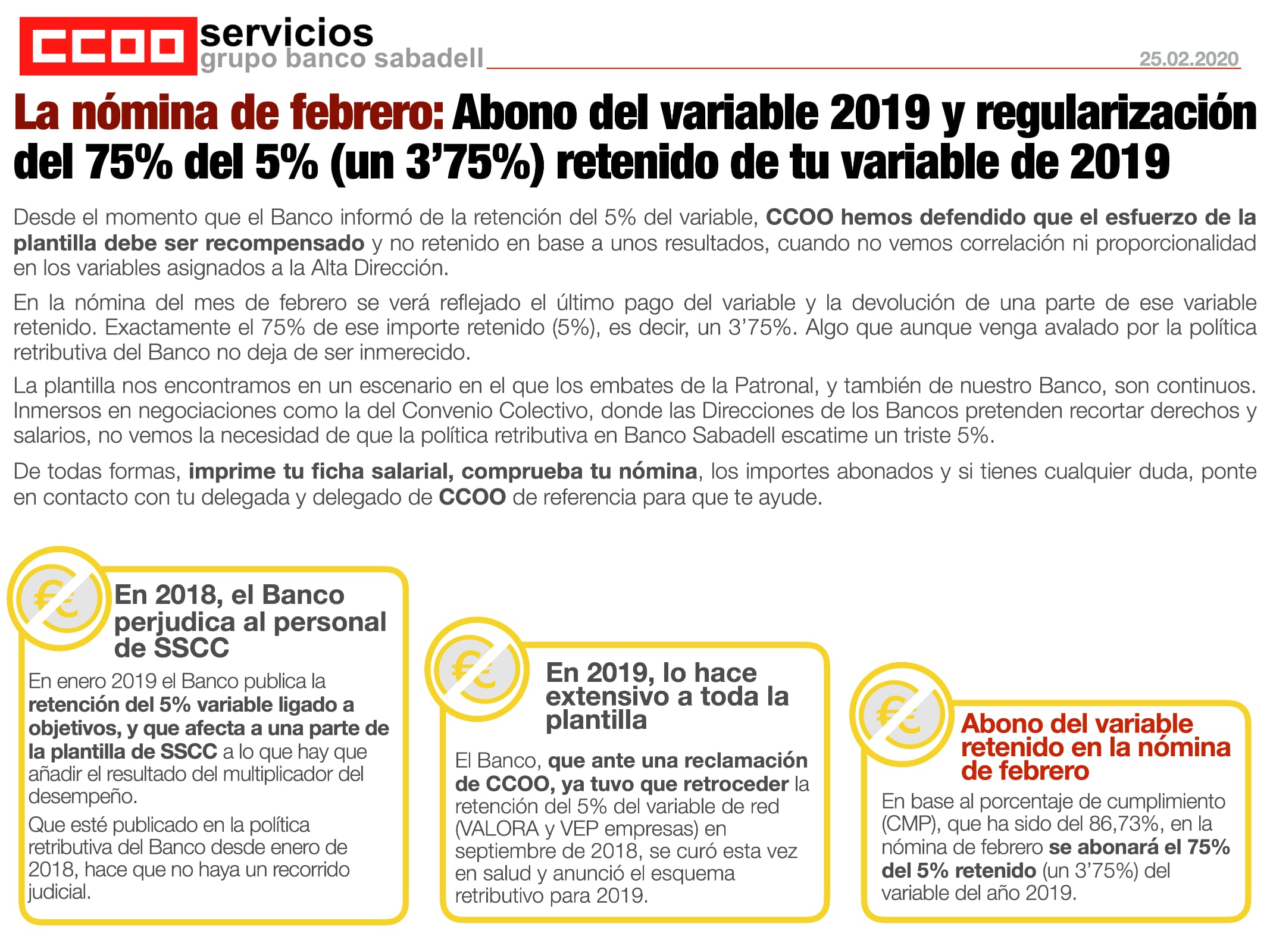 En la nómina de febrero el Banco abonará el porcentaje del 5% variable retenido en 2019 en base a las tablas que publicó