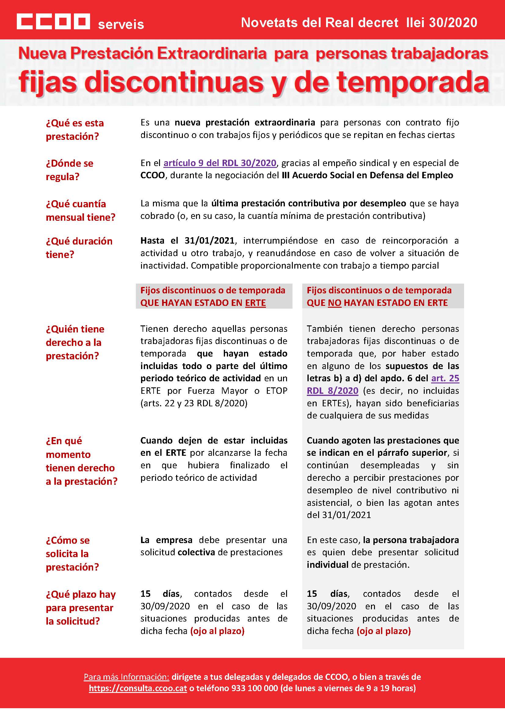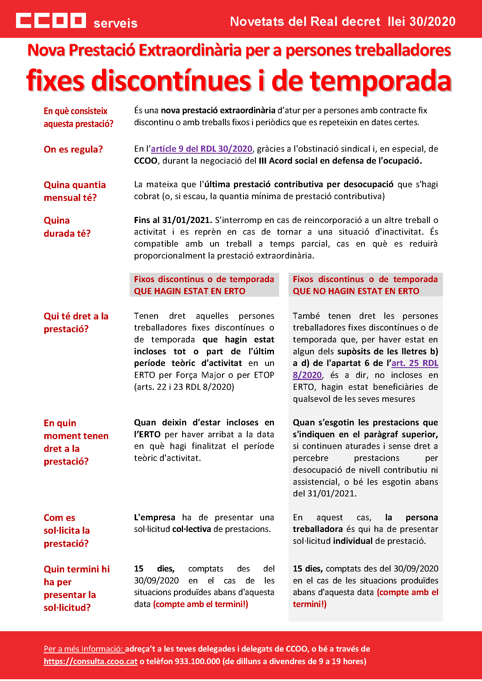 >> Comunicat sobre la prestació que introdueix el RD 30/2020 sobre Fixos Discontinus – guía de la prestació.(PDF català y castellano