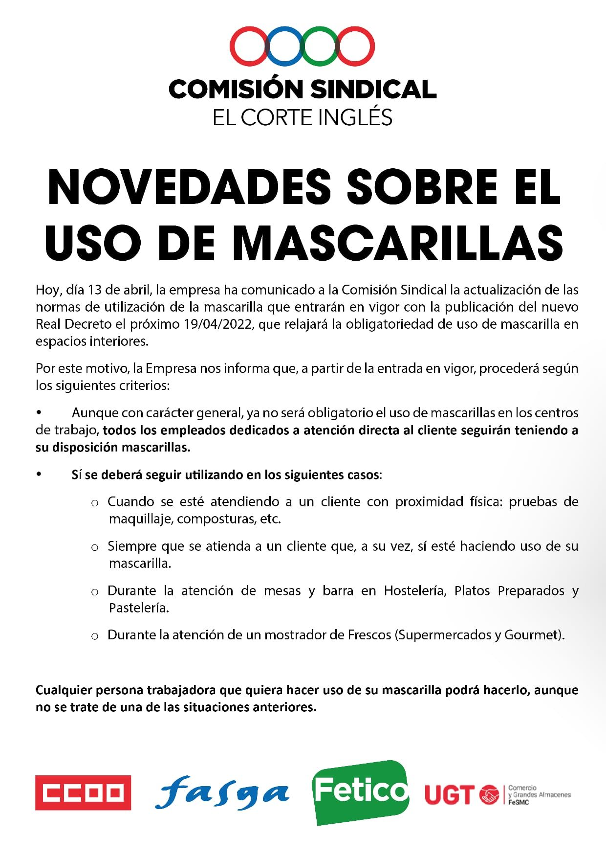 La empresa ha comunicado a la Comisión Sindical la actualización de las normas de utilización de la mascarilla que relajará la obligatoriedad de su uso en interiores.