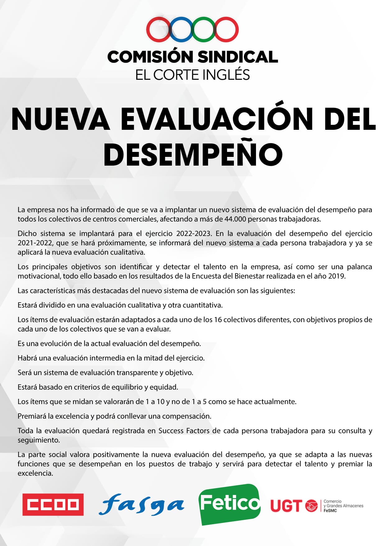 La empresa ha reunido al Comité Intercentros y hemos negociado un nuevo sistema de evaluación del desempeño para todos los colectivos de centros comerciales. Los principales objetivos son identificar y detectar el talento en la empresa, así como ser una palanca motivacional.