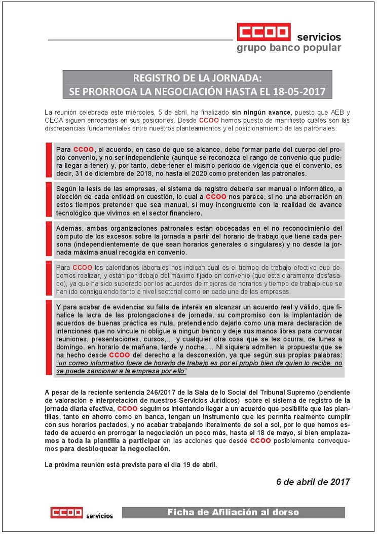 En la reunión celebrada este miércoles 5 de abril, se ha finalizado sin ningún avance, puesto que AEB y CECA siguen enrocadas en sus posiciones. Sin embargo, se ha acordado firmar una nueva prórroga hasta el 18 de mayo. Próxima reunión el 19 de abril.