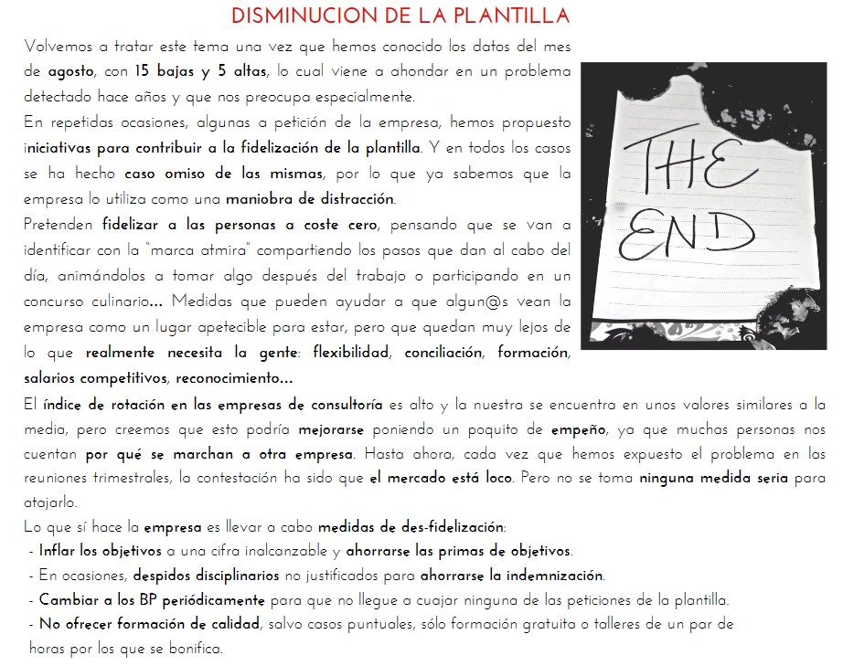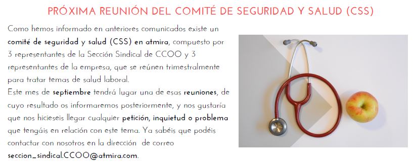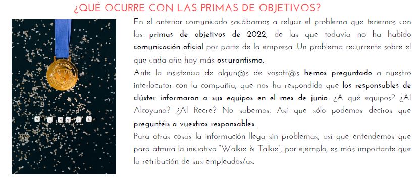 En el presente comunicado continuamos con el problema recurrente de las primas de objetivos, insistimos en la pérdida de personal de la empresa de un tiempo a esta parte, informamos de la próxima reunión del comité de seguridad y salud (CSS) y os traemos un par de noticias relativas al teletrabajo.