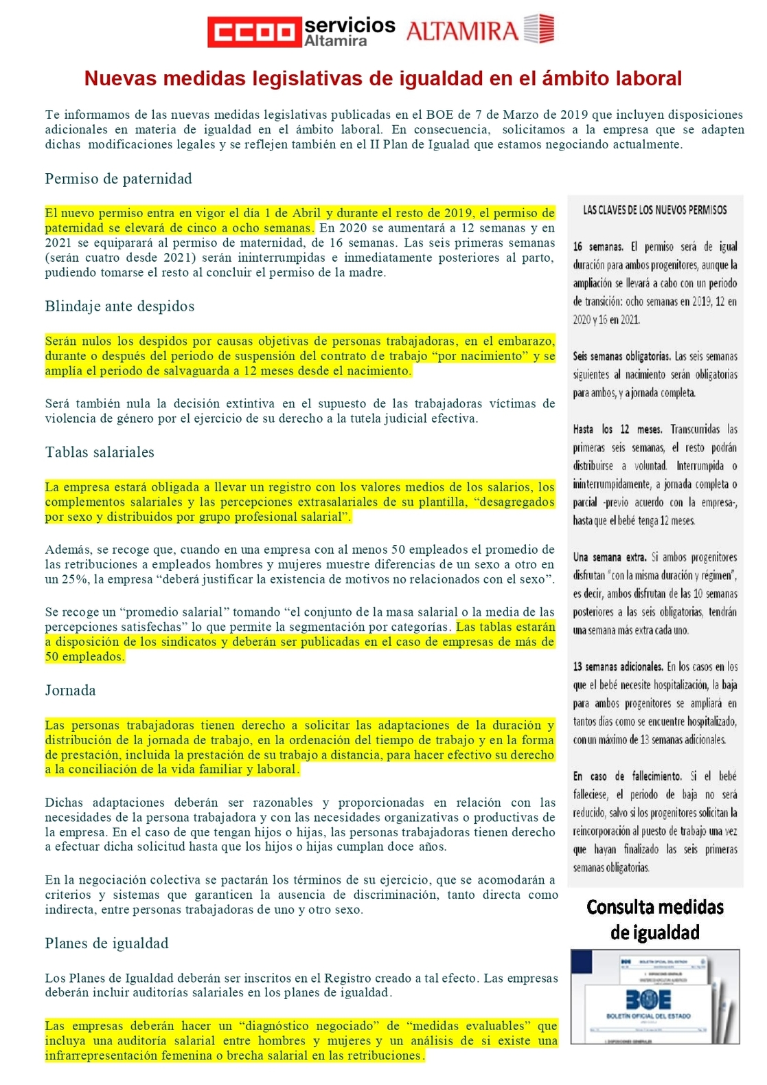 Te informamos de las nuevas medidas legislativas publicadas en el BOE de 7 de Marzo de 2019 que incluyen disposiciones adicionales en materia de igualdad en el ámbito laboral. En consecuencia, solicitamos a la empresa que se adapten dichas modificaciones legales y se reflejen también en el II Plan de Igualad que estamos negociando actualmente.