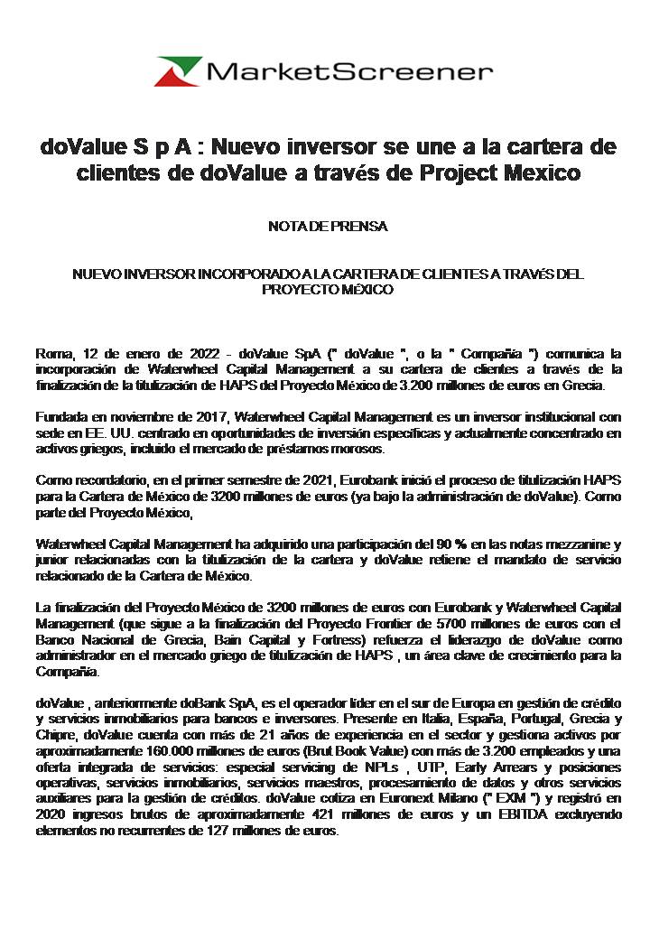 doValue comunica la incorporación de Waterwheel Capital Management a su cartera de clientes a través de la finalización de la titulización de HAPS del Proyecto México de 3.200 millones de euros en Grecia.