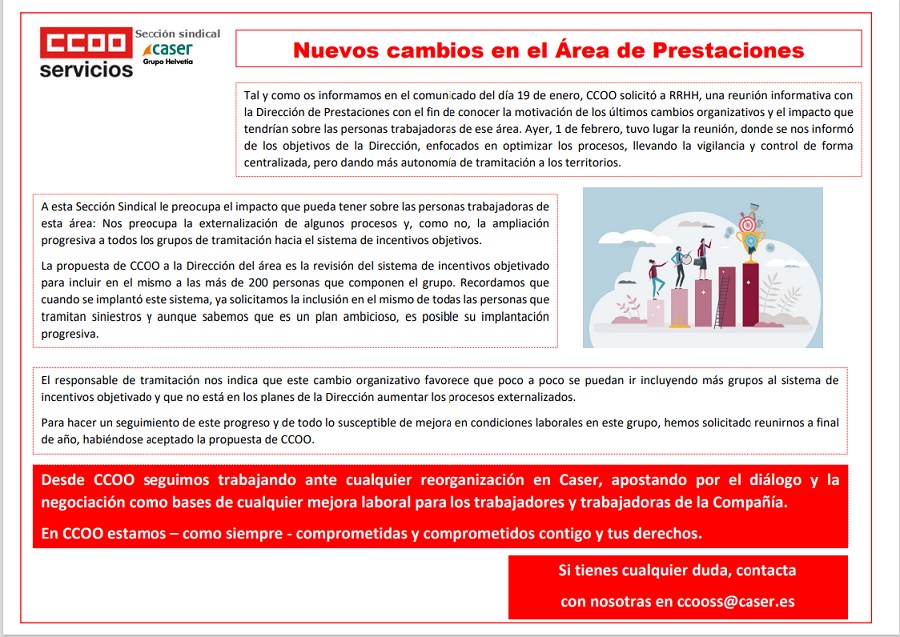 Tal y como os informamos en el comunicado del día 19 de enero, CCOO solicitó a RRHH, una reunión informativa con la Dirección de Prestaciones con el fin de conocer la motivación de los últimos cambios organizativos y el impacto que tendrían sobre las personas trabajadoras de ese área. Ayer, 1 de febrero, tuvo lugar la reunión, donde se nos informó de los objetivos de la Dirección, enfocados en optimizar los procesos, llevando la vigilancia y control de forma centralizada, pero dando más autonomía de tramitación a los territorios.