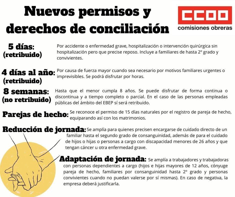 Con su publicación en el BOE han entrado en vigor una serie de nuevos permisos y derechos de conciliación. Las delegadas y delegados de CCOO resolverán las dudas que se puedan plantear en cada caso concreto.