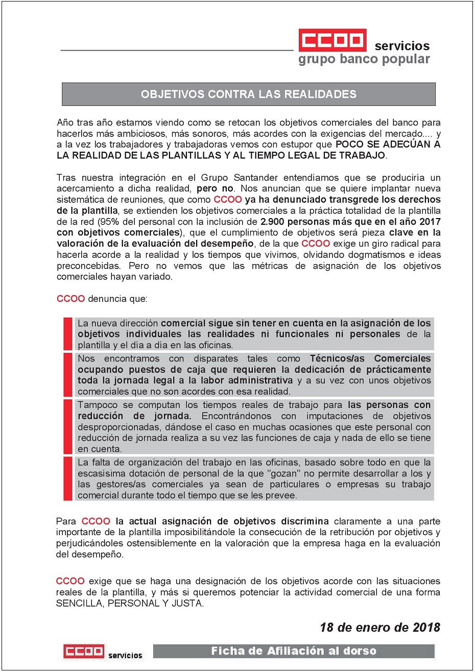 Año tras año estamos viendo como se retocan los objetivos comerciales del banco para hacerlos más ambiciosos, más sonoros, más acordes con la exigencias del mercado…. y a la vez los trabajadores y trabajadoras vemos con estupor que POCO SE ADECÚAN A LA REALIDAD DE LAS PLANTILLAS Y AL TIEMPO LEGAL DE TRABAJO.