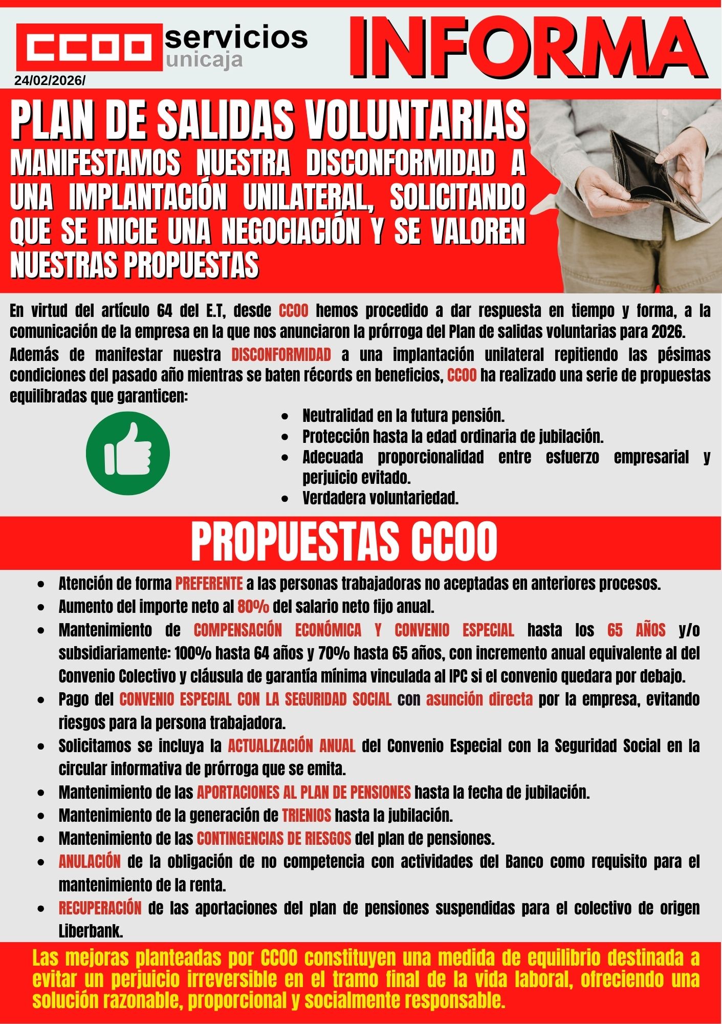 Además de manifestar nuestra DISCONFORMIDAD a una implantación unilateral repitiendo las pésimas condiciones del pasado año mientras se baten récords en beneficios, CCOO ha realizado una serie de propuestas equilibradas que garanticen: