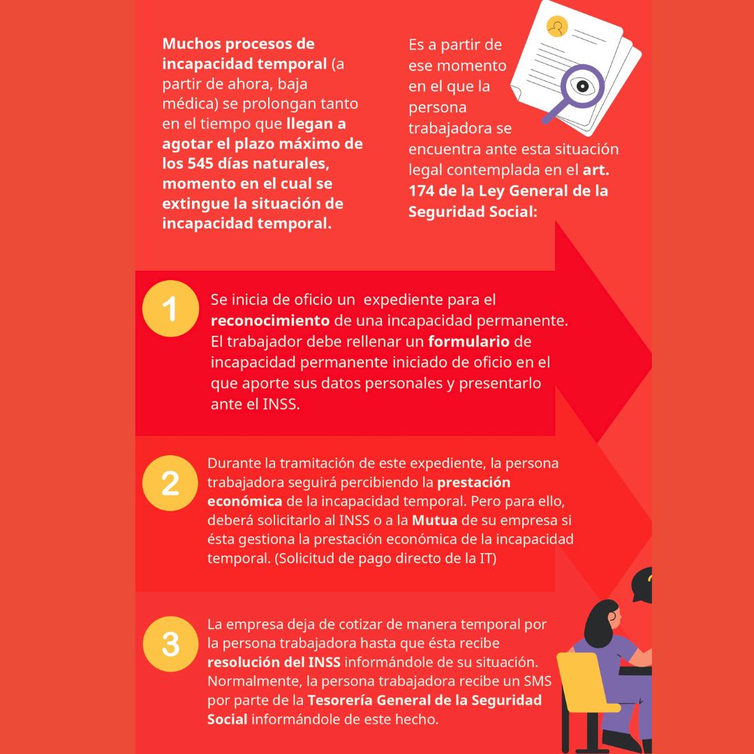 A partir de los 545 días naturales de incapacidad se extingue la situación de baja médica, a partir de ese momento la persona trabajadora se encuentra ante una situación legal prevista por el arte. 174 de la Ley General de la Seguridad Social y se inicia de oficio un expediente para el reconocimiento de una incapacidad permanente.