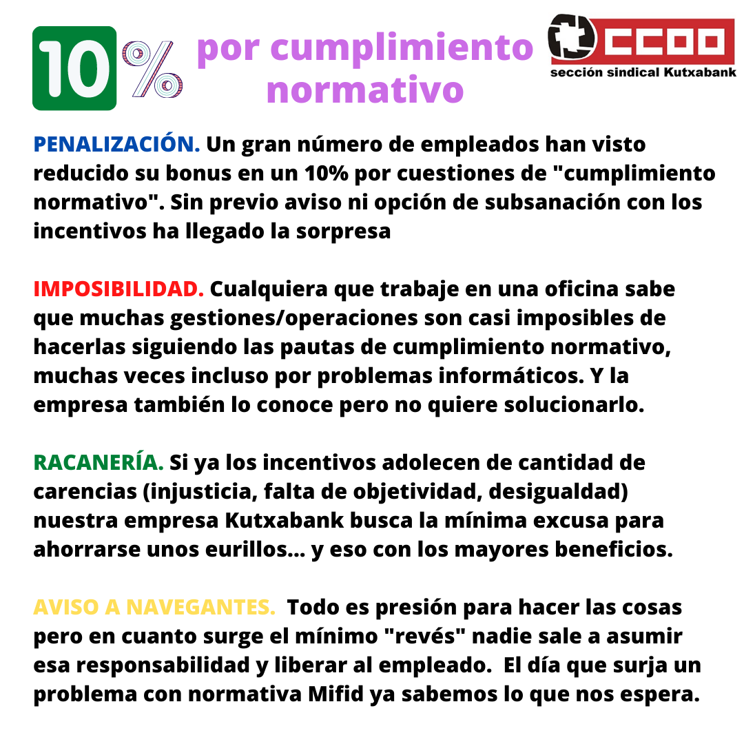 Lo llaman cuestiones de cumplimiento normativo y supone un 10% menos para quienes tenían que cobrar incentivos. Nos parece una injusticia porque es casi imposible evitarlo y denunciamos la actitud de racanería de Kutxabank.