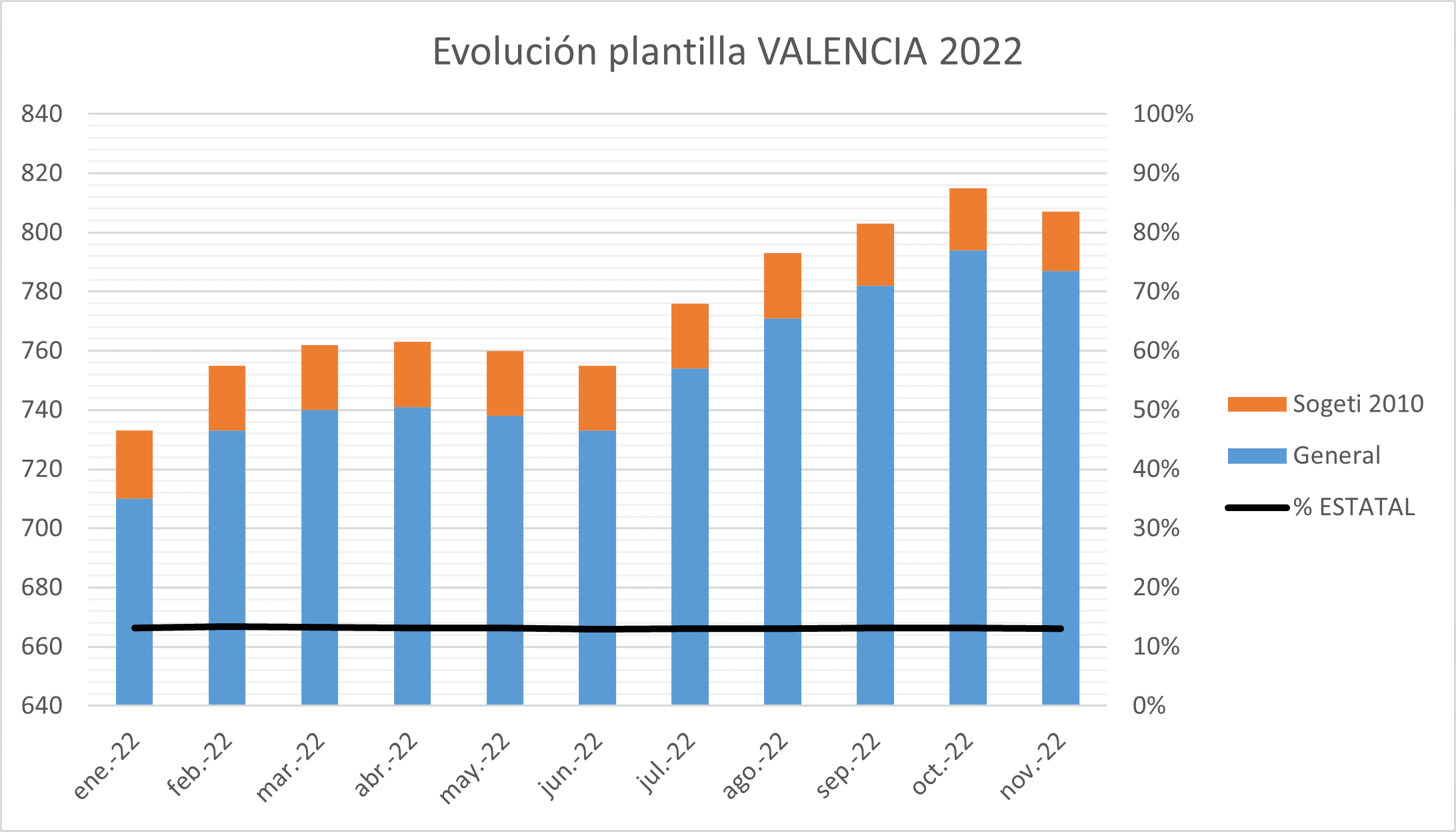 La evolución de nuevas incorporaciones se ha visto frenada durante Noviembre y continuó esta tendencia en Diciembre, mientras la alta rotación continúa en la misma línea, ya que aunque también se han ralentizado las bajas, el dato oficial del mes de Noviembre nos muestra un número de bajas que casi dobla al de altas en el centro, por lo que la plantilla disminuye ligeramente situándonos en algo más de 800 trabajadoras y trabajadores.