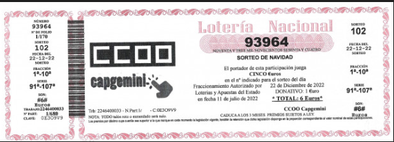 Ya está a nuestra disposición el número elegido para el Gordo de este año 2022 como venimos informando en todos nuestros comunicados. No dejes pasar esta oportunidad y juega con nosotros. Para poder adquirir las participaciones de loteria de CCOO-Capgemini, entra en el siguiente enlace de compra.
