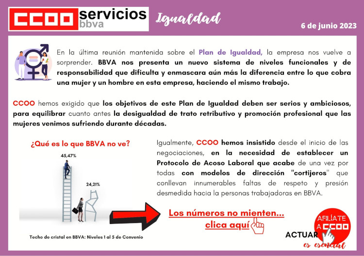 CCOO hemos exigido que los objetivos de este Plan de Igualdad deben ser serios y ambiciosos, para equilibrar cuanto antes la desigualdad de trato retributivo y promoción profesional que las mujeres venimos sufriendo durante décadas.
