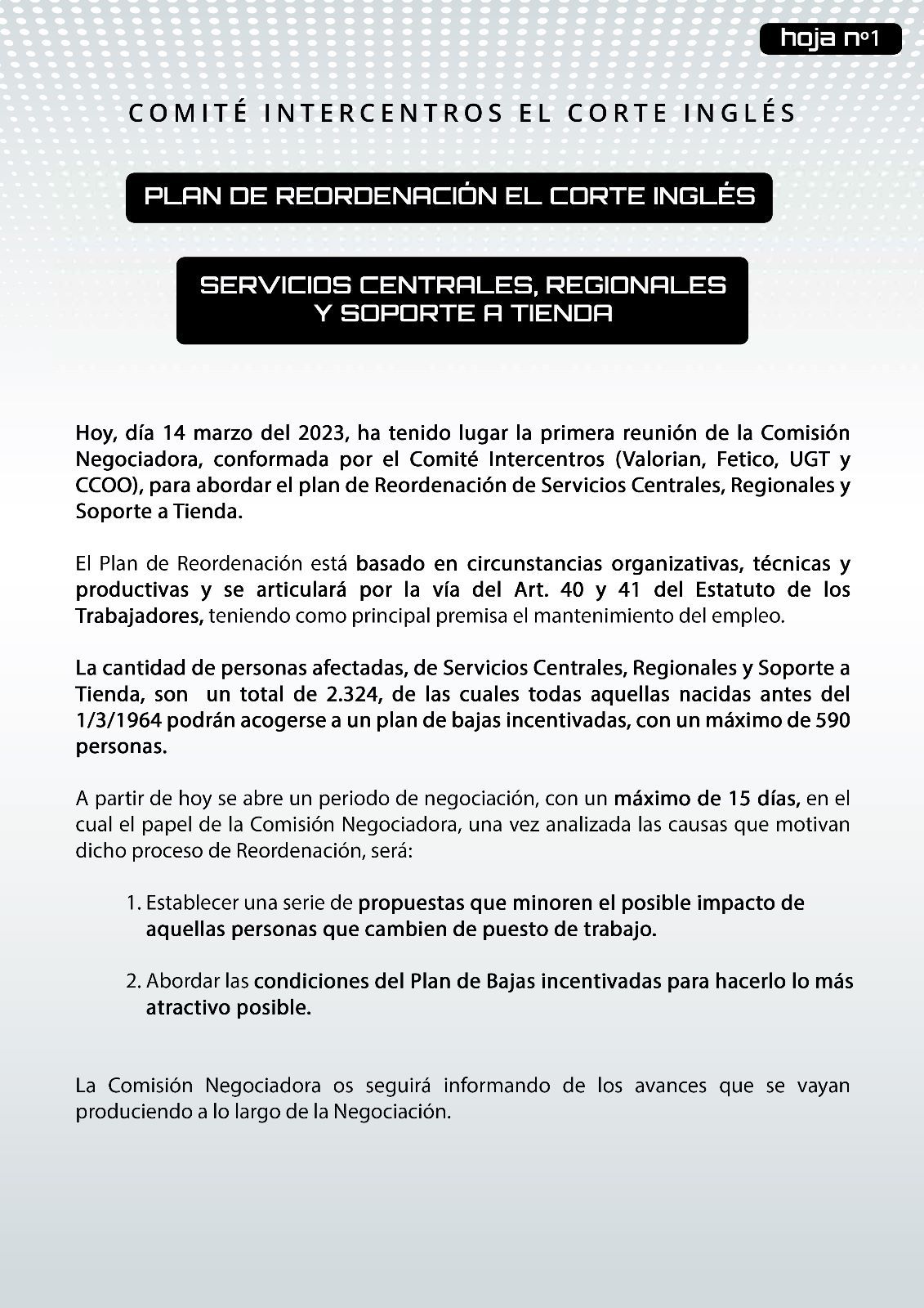 Hoy, 14 de marzo de 2023, se ha mantenido la primera reunión de la comisión negociadora para abordar el plan de Reordenación de Servicios Centrales, Regionales y Soporte a Tienda.