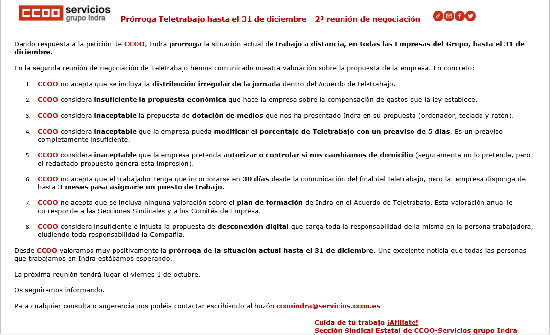 Prórroga Teletrabajo hasta el 31 de diciembre – Segunda reunión de negociación