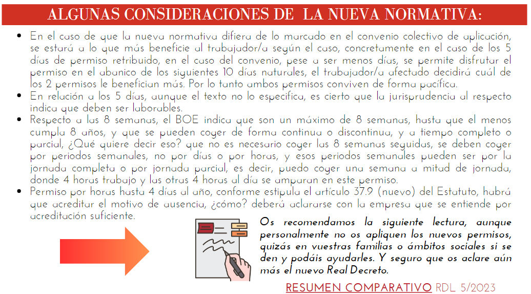 Permiso retribuido de cuidado de 5 días, permiso retribuido “por causa de fuerza mayor” por horas hasta 4 días al año, permiso “parental” de 8 semanas, reconocimiento de permiso retribuido de 15 días por registro de pareja de hecho, así como otras medidas en materia de reducción y adaptación de jornada.