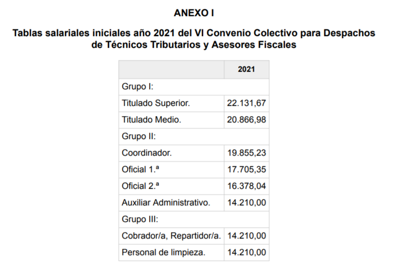 Tablas salariales iniciales para el año 2021 elaboradas según lo dispuesto en el artículo 3 del VI Convenio Colectivo para despachos de Técnicos Tributarios y Asesores Fiscales, de ámbito estatal (código de convenio n.º 9912405011999), que fueron elaboradas y acordadas en la reunión celebrada en el SIMA el pasado 22 de abril de 2021.